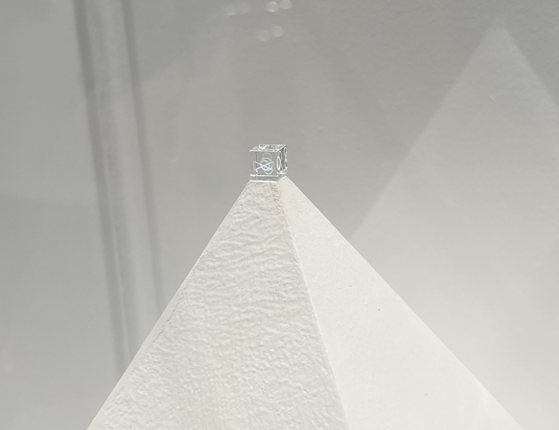 Close-up of Kac’s Adsum, which landed on the Moon on March 2, 2025, on view at Baró Galeria, Abu Dhabi, during the exhibition The Other Side of the Moon (May 15–September 1, 2025).. Exhibition view of Kac's drawings from the Adsum series, as seen at Baró Galeria, Abu Dhabi, during the exhibition The Other Side of the Moon (May 15 to September 1, 2025). Installation view of Kac's Adsum (the white pyramid near the back wall) and a drawing (right) from the Adsum series, as seen at at Baró Galeria, Abu Dhabi, during the exhibition The Other Side of the Moon (May 15 to September 1, 2025). Baró Galeria, Abu Dhabi, during the exhibition The Other Side of the Moon (May 15 to September 1, 2025).